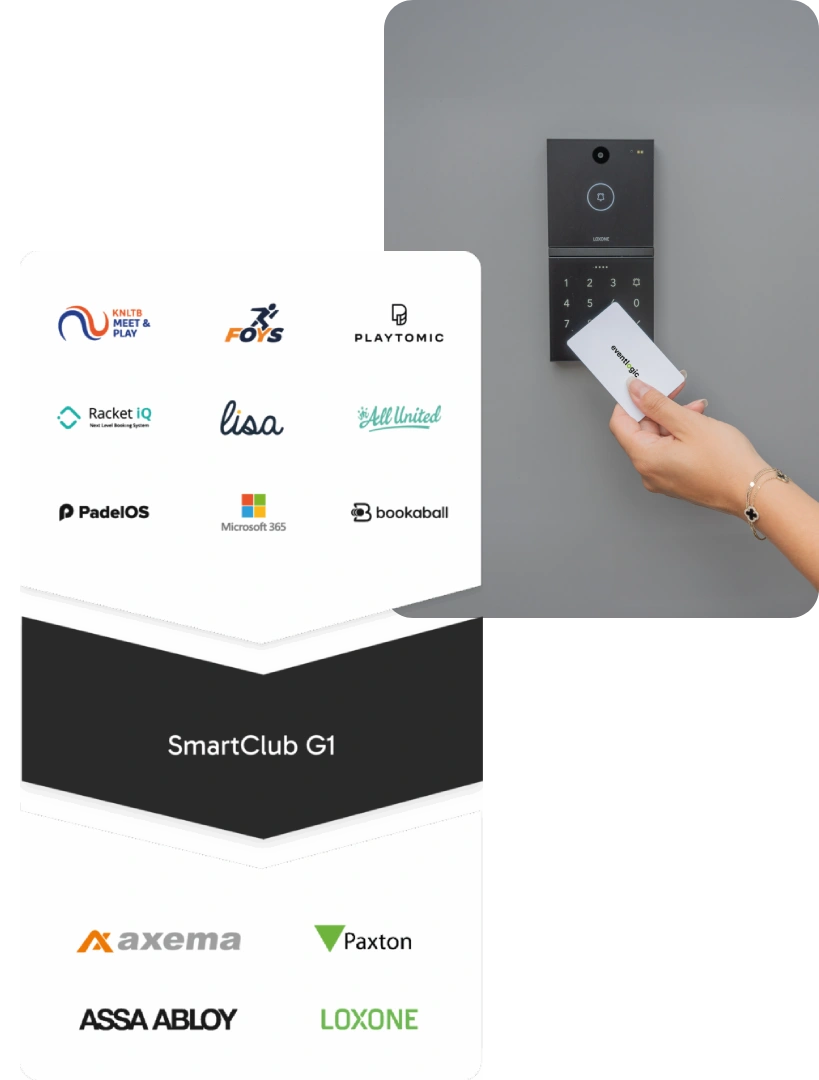 Reserveringen, pasgegevens en pincodes worden automatisch uitgewisseld met het gekozen toegangssysteem (bijv. Loxone, Axema VAKA, Paxton, Assa Abloy). De SmartClub G1 zet deze gegevens lokaal door, zodat de toegang ook werkt wanneer de internetverbinding even wegvalt.